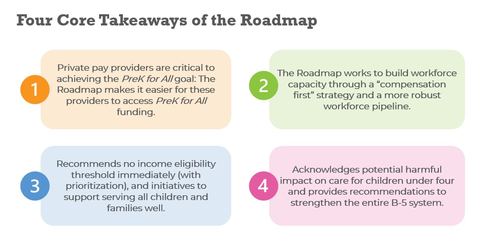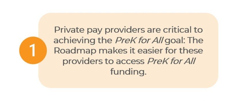 To achieve that goal, the Roadmap recommends ensuring funding could be accessed by more community-based providers and creating a home-based early learning provider pilot that would allow existing home-based providers a new pathway to participate in the PreK For All program.