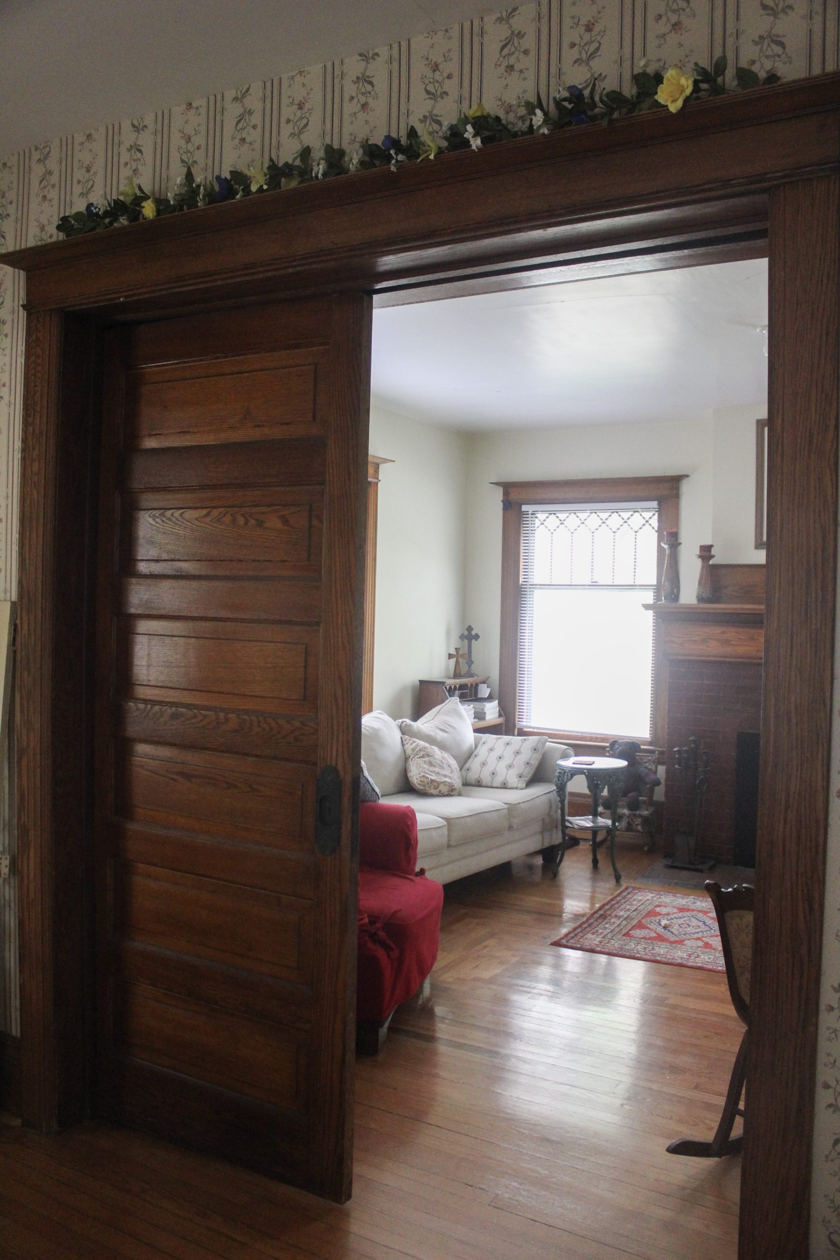 Several features of the home are indicative of its entertainment purpose, one of which being the wooden pocket door that creates a barrier between the foyer and the living room. If guests were coming by, the door could slide into the wall and open up the space, making it easier for everyone to move about the rooms.