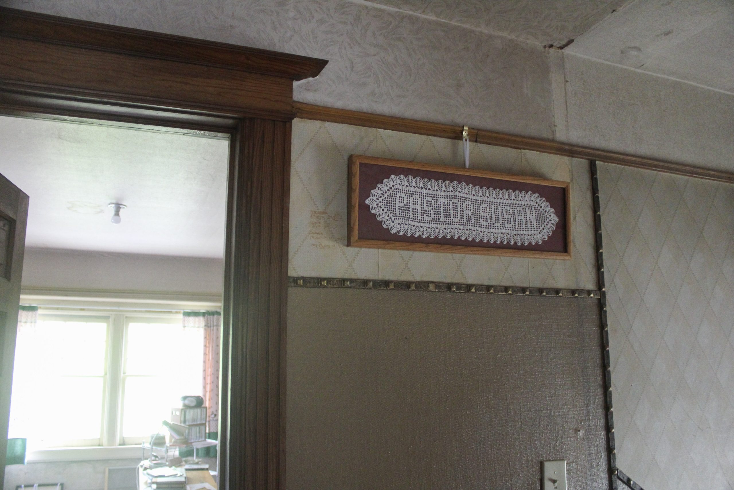 In the Sickelka’s bedroom, there is a portion of wallpaper peeled back from the wall. They were attempting to find out whether the paper was original, and since they only found plaster behind it, David’s assumption is that it predates the Shurtliffs.