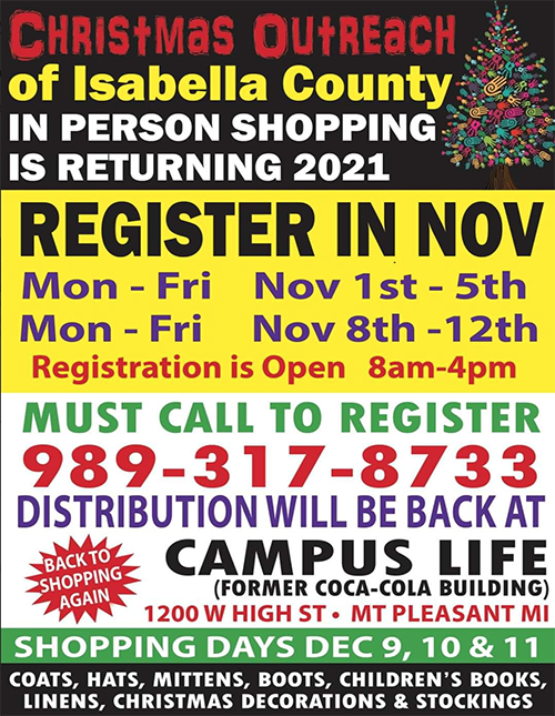 Registration for Christmas Outreach will begin in November. The two rounds of registration will be held from 8 a.m. to 4 p.m. on Nov. 1-5 and Nov. 8-12. Guests must call to register at (989) 317-8733.