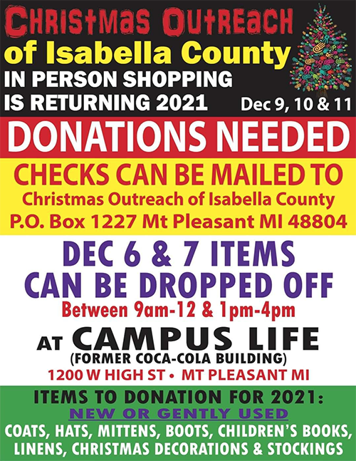 Christmas Outreach of Isabella County is returning in person this holiday season after pivoting to a drive-thru style in 2020.