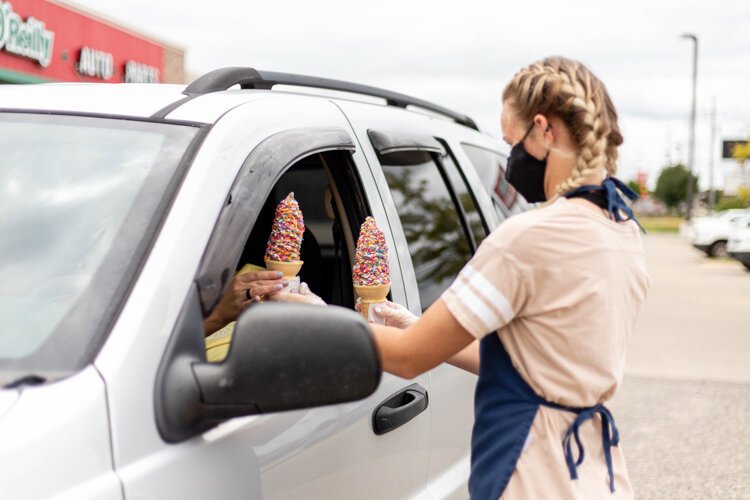 Should you stop by Doozie’s yet this summer, you’ll get a different experience than you’re used to. Instead of the regular ordering scheme where one approaches the window and turns with ice cream in hand to find a picnic table to sit at on the establishment’s property, you’ll have to remain in your vehicle at one of the shop’s parking spaces. Following a quick call to the number on the sign in front of you, your order will be in motion and your sweet treat will soon find its way to you by means of one of Doozie’s ice cream runners.