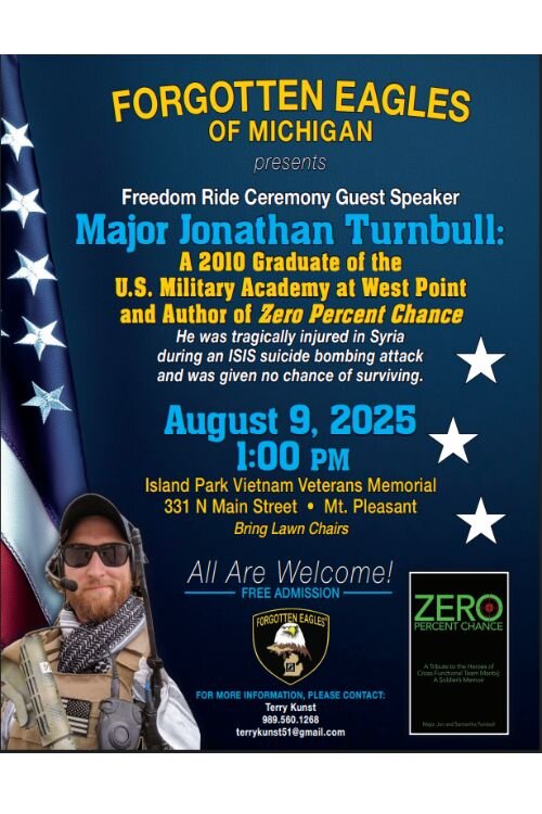 Army Veteran and community activist Major Jonathan Turnbull was tragically injured in an ISIS suicide bombing attack while serving in Syria, and was given no chance of surviving. The people and events leading up to and following his recovery inspired Turnbull to author a book entitled, “Zero Percent Chance.” Turnbull will speak about his experiences as well as his current life and aspirations at the Vietnam Veterans War Memorial in Island Park. This event is free and open to the public. Attendees are asked to bring lawn chairs.