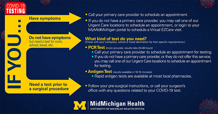 - MidMichigan Health does not provide any walk-in COVID testing. All testing requires an appointment and will typically be the more accurate PCR tests.