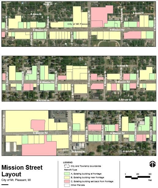 The above-mentioned measures – roundabouts and an additional US-127 ramp – are some of the actions in the Mt. Pleasant 2050 Master Plan to make Mission Street a safer place for pedestrians. To make it more inviting for pedestrians to shop, the plan also states, “in order to keep retail districts within lengths manageable for pedestrians, retail activity is concentrated at intermittent nodes along the Mission Street Corridor.”