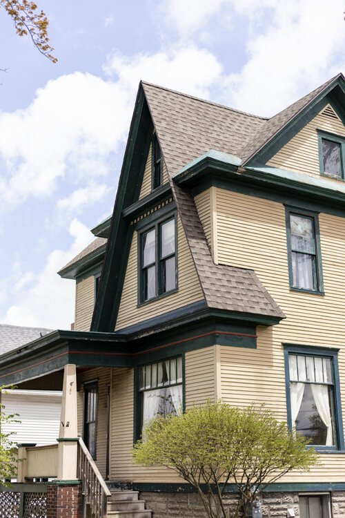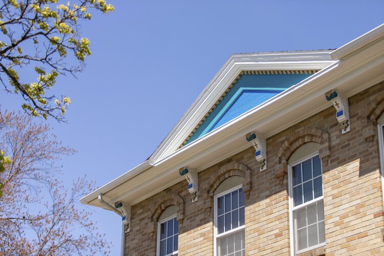 Quinn Kirby – An overview of roofing at 503 East Broadway boasts blue and gold details.