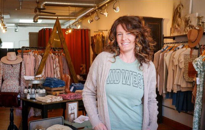 Clare native Lacey Badelt, 38, claims she doesn’t know much about fashion but step inside her quaint Calla Lily Mercantile (named after two of her three daughters) and you’ll beg to differ. Trendy seasonal outfits—complete with footwear, hats, purses and accessories—line the exposed brick walls.