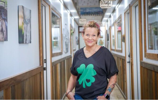 At Cardinal & Clover Collaborative, Christine Smith (another Clare native) restored and repurposed the former William H. Bicknell & Co. Department Store (which had housed a variety of other businesses over the years) into a micro shopping district. Upstairs there are still remnants of where seamstresses once worked their stations to outfit the townspeople and the pully system where orders and payments were sent for processing. Opened in 2022, the 20,000-square-foot building is now a collection of 12 shops and businesses, each with distinct spaces and services including a hair salon, tattoo studio, boutiques, yoga studio, handmade jewelry store and more.